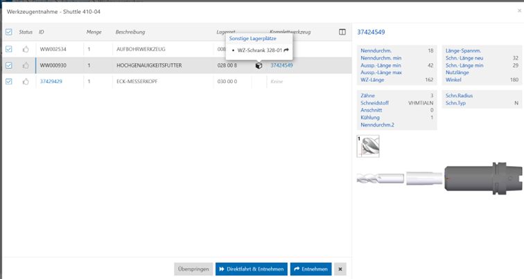 - Liegen die benötigten Werkzeugkomponenten in verschiedenen Lägern, werden diese alternativen Lagerorte den Mitarbeitern im Einstellraum zur Auswahl angezeigt. Zudem erhält der Mitarbeiter eine Bestandsübersicht der dort eingelagerten Teile und kann jetzt eines oder auch mehrere Werkzeugelemente entnehmen