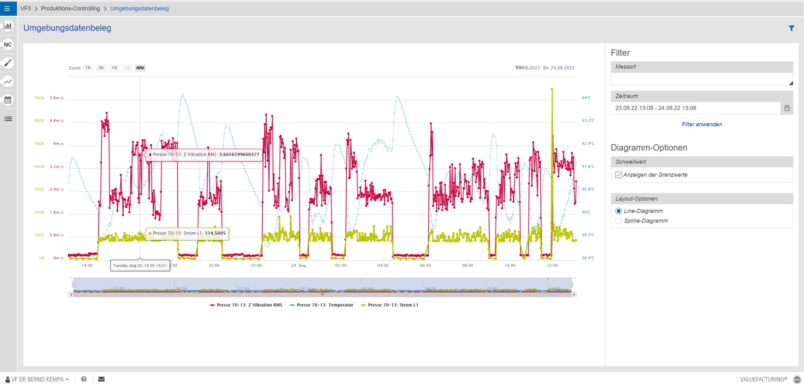 Dazu können bereits vorhandene Sensoren in ValueFacturing® integriert werden oder unsere Experten helfen Ihnen bei der Integration neuer Sensorik. Natürlich sind Sie nicht auf Zerspanungsmaschinen beschränkt. Auch für andere Produktionsanlagen wie Pressen, Öfen und Lackieranlagen können Sensordaten in ValueFacturing® visualisiert werden.