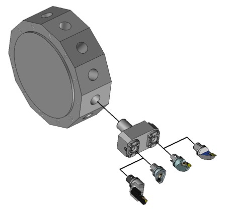 Insbesondere bei Drehmaschinen werden häufig Mehrfachhalter eingesetzt. Da diese aufwändig zu justieren sind und der Schneidenverschleiß unterschiedlich hoch sein kann, ist ein kompletter Werkzeugwechsel inklusive Grundhalter in der Regel zeitintensiv, fehleranfällig und nur selten erforderlich. ValueFacturing® bietet für diesen speziellen Fall die Möglichkeit, einzelne Werkzeugkomponenten für den Mehrfachhalter separat bereitzustellen, ohne den gesamten Grundhalter mit allen schneidenden Elementen austauschen zu müssen. Der Bereitstellungsprozess einzelner Werkzeugkomponenten folgt dabei exakt dem Ablauf für Komplettwerkzeuge.