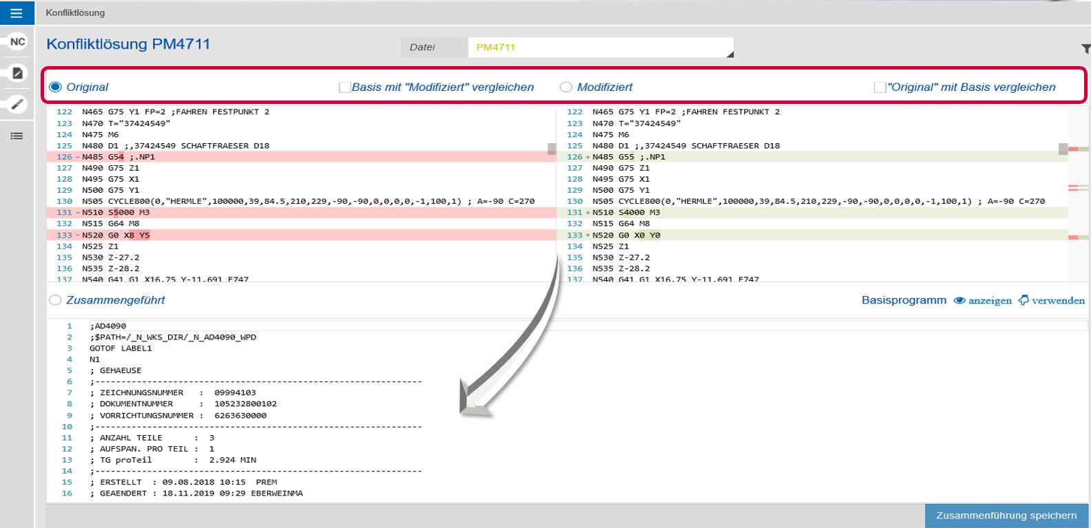 Das AddOn Konfliktmanagement zeigt diese Konflikte auf und ermöglicht der CAM-Programmierung eine Entscheidung zu treffen, welche Änderungen in das neue Originalprogramm übernommen werden sollen. Werden keine konfliktrelevanten Änderungen in den verschiedenen Programmversionen erkannt, erfolgt die Rückführung in die NC-Datenbank vollautomatisch.