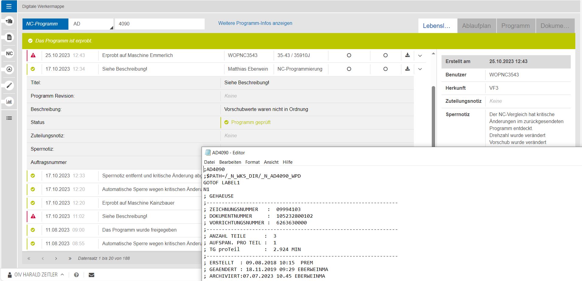 Alle Programmänderungen werden bei der Rückübertragung von ValueFacturing® zu dem entsprechenden Lebenslaufeintrag gespeichert und ermöglichen so eine softwaretechnische Wiederherstellung jedes historischen Programmstandes. So können z.B. Schnittwerte und Werkzeuge auch nach Jahren noch im damals verwendeten NC-Programm eingesehen werden.