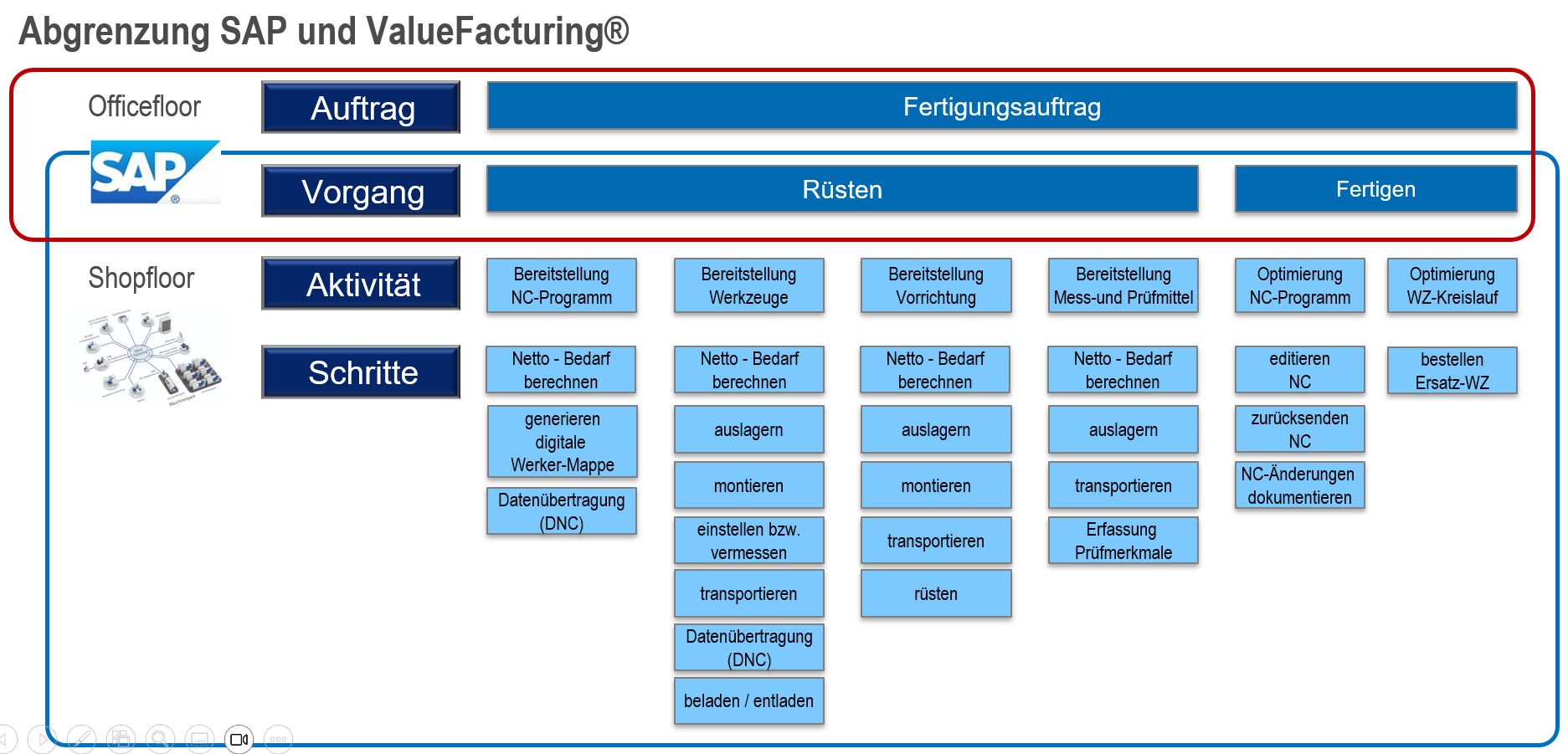 ValueFacturing® bietet eine ganze Reihe dieser nützlichen Systemerweiterungen. Das am häufigsten genutzte Add-On ist unser virtuelles Magazin. Es ist durch seine integrierte Werkzeugverwaltung und dem digitalen Rüstplan die schnellste Möglichkeit zum Umrüsten von Drehmaschinen. Speziell für unsere SAP-Kunden wurde von unseren SAP-Experten eine Erweiterung für die optimale Integration von ValueFacturing® und SAP entwickelt.