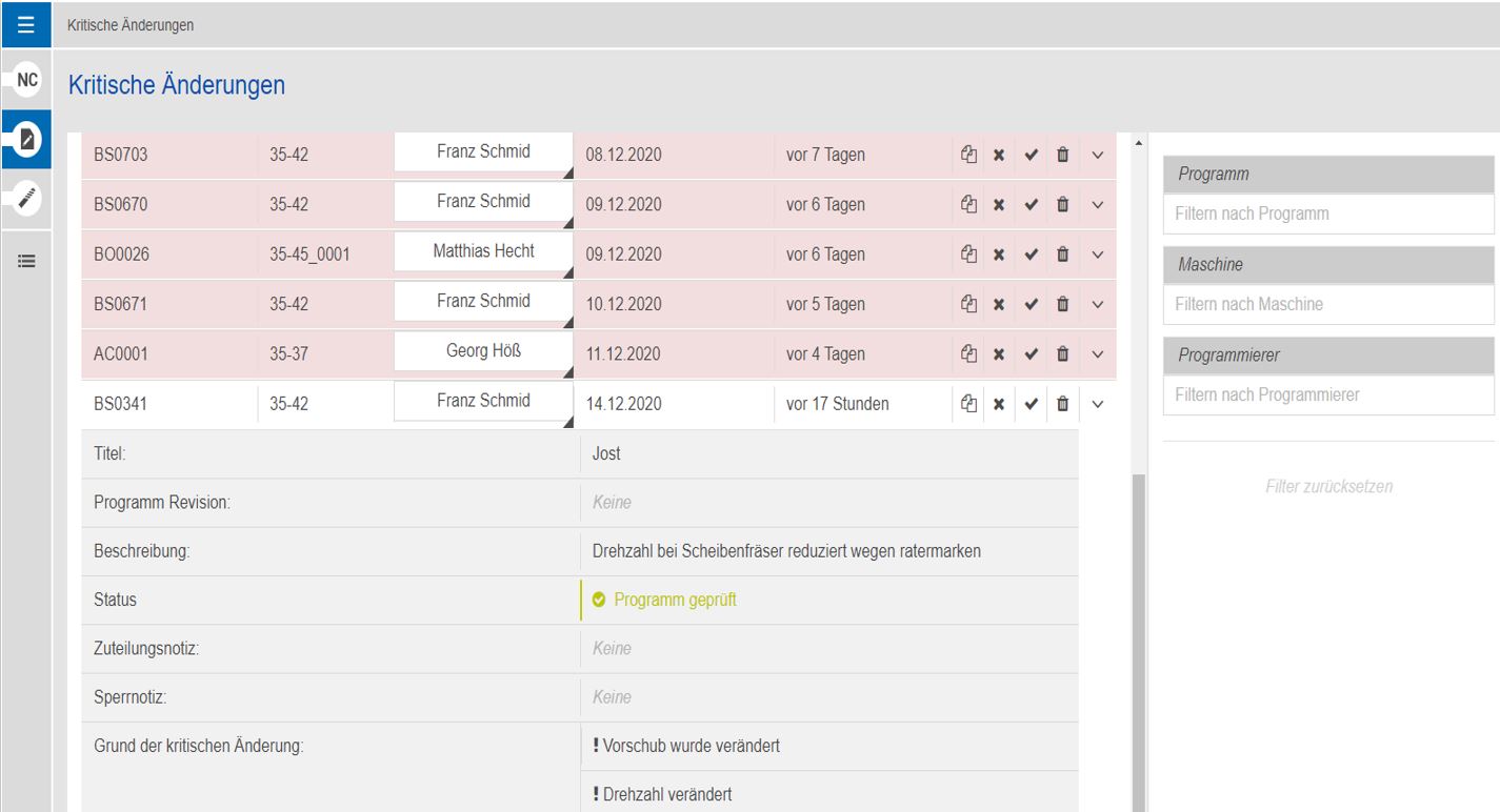 Unser Softwaresystem erkennt bei Rückübertragung des NC-Programms automatisch , ob es sich um eine „kritische“ und „unkritische“ Änderung handelt. Welche Änderungen kritisch sind, ist frei konfigurierbar. Ebenso ist konfigurierbar, wer kritische Änderungen per Workflow freigeben muss und ob das NC-Programm bis zur Freigabe für die weitere Verwendung gesperrt wird.