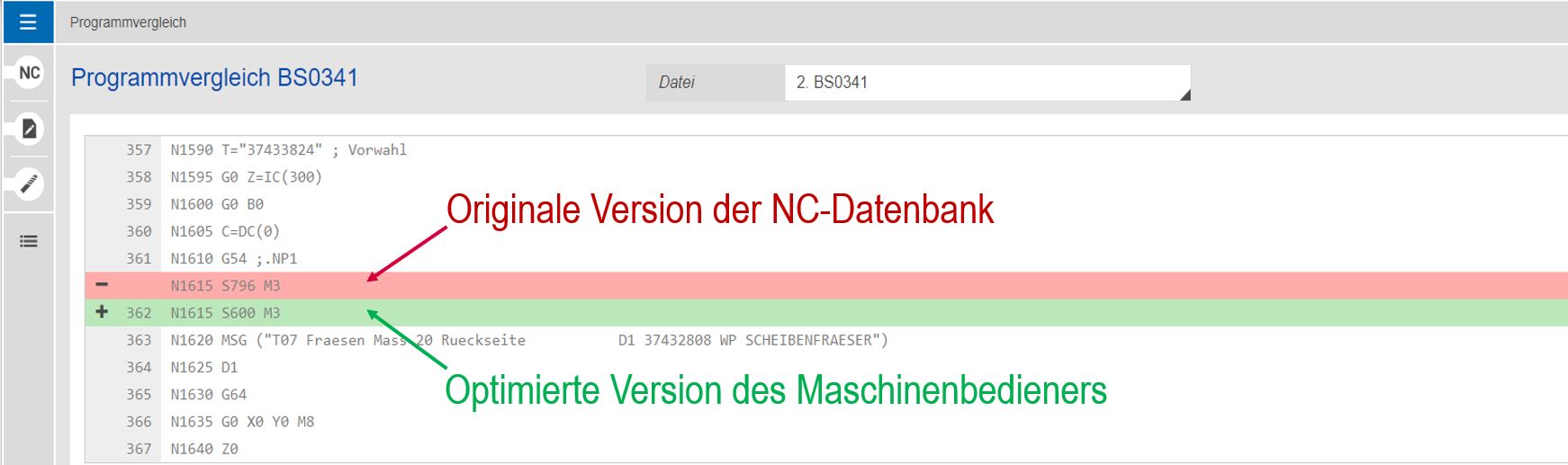 Der systemgestützte NC-Programmvergleich stellt sicher, dass auch bei umfangreichen NC-Programmen (einschließlich ihrer Unterprogramme) keine Programmanpassung verloren geht und eine kontinuierliche Programmoptimierung auf Basis der Erkenntnisse der Maschinenbediener erfolgt.