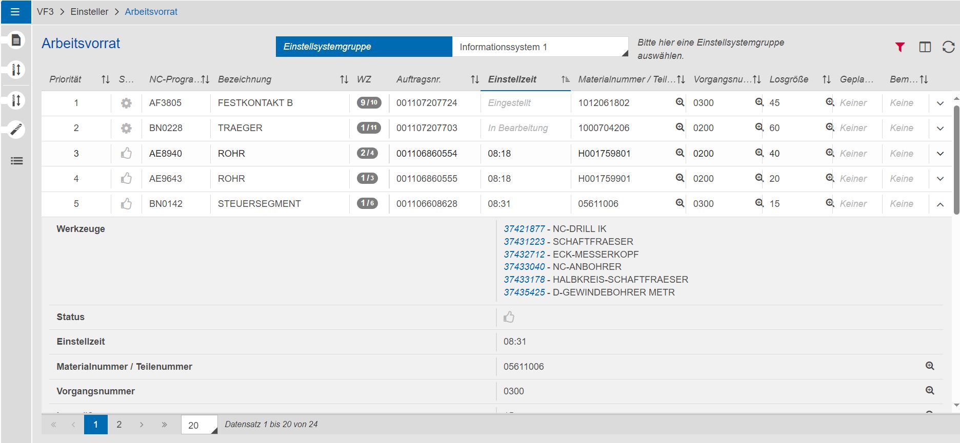 Umpriorisierungen von Arbeitsgängen in ValueFacturing® oder im angebundenen Planungssystem werden direkt im Arbeitsvorrat der Werkzeugvoreinstellung sichtbar. Beim Einsatz mehrerer Werkzeugvoreinstellgeräte, erhält jedes Gerät eine eigene konfigurierbare Arbeitsvorratsliste.