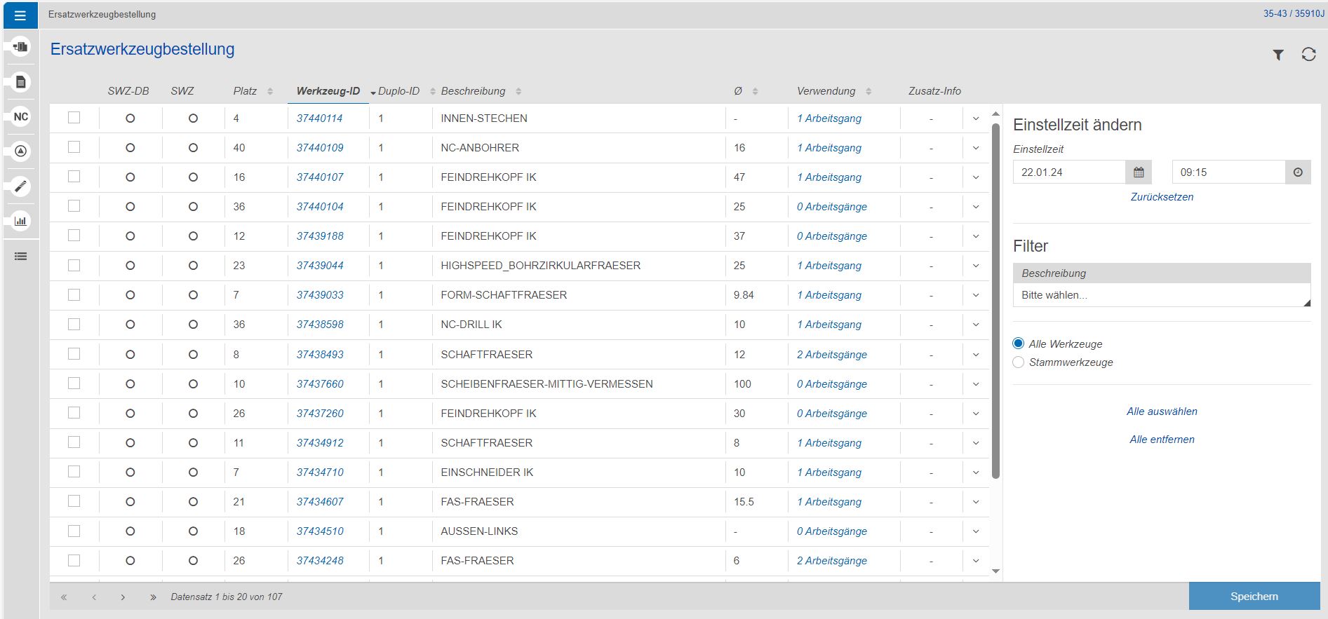 Damit das Warten auf Ersatzwerkzeuge nicht zu unnötigen Maschinenstillständen führt, fordert der Maschinenbediener Ersatzwerkzeuge direkt über ValueFacturing® an, die dann vom System mit höchster Priorität im Werkzeugvoreinstellraum eingeplant, bearbeitet und an die Maschinen geliefert werden. Unterstützt wird der Maschinenbediener bei der Werkzeuganforderung durch die Anzeige aller Werkzeuge im Magazin oder zum Arbeitsgang. Selbstverständlich können auch die Gründe von Ersatzwerkzeugbestellungen erfasst und systematisch ausgewertet werden.