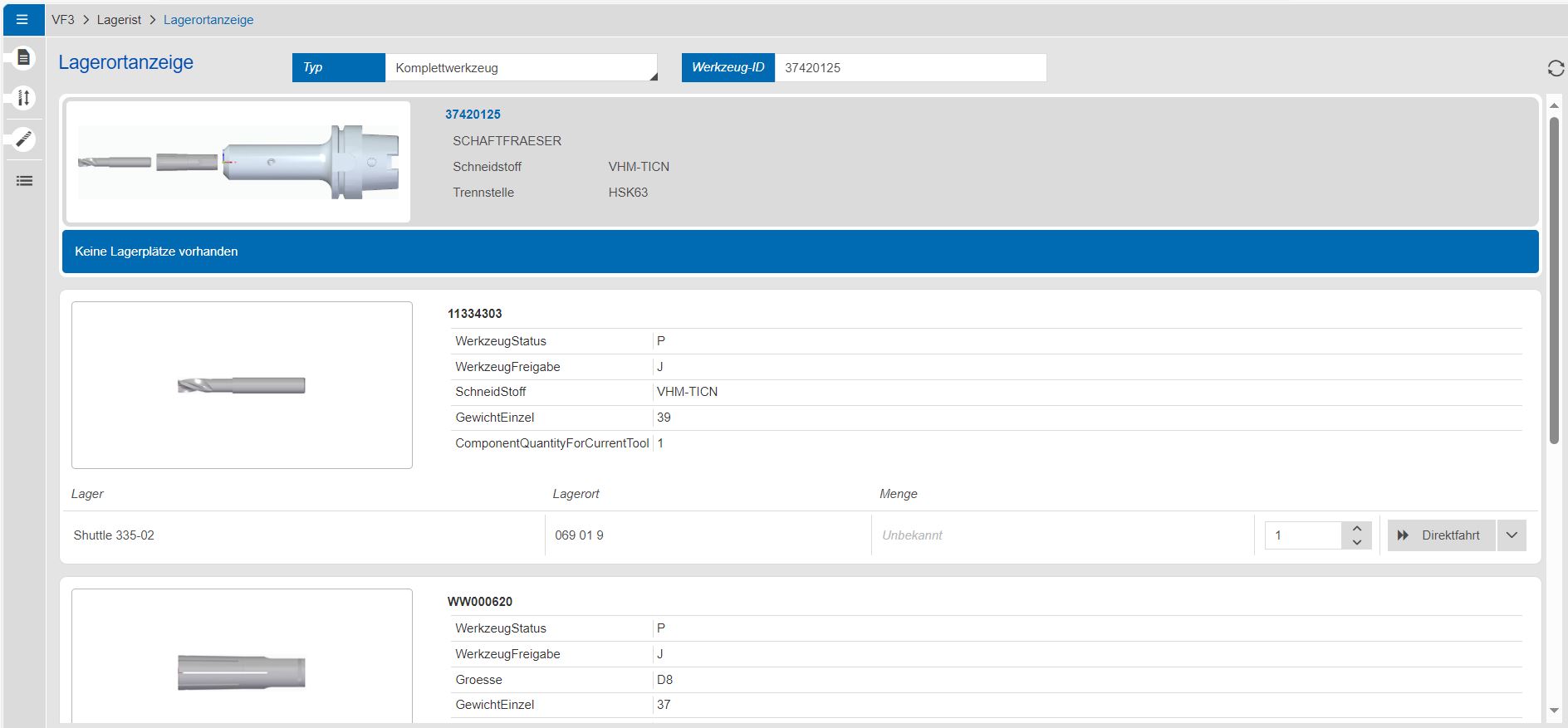 Bei digital gesteuerten Lagersystemen (wie z.B. von Kardex oder Gühring) werden die entsprechenden Entnahmeaufträge auf deren Steuerung übergeben und die Entnahme angestoßen. Bei nicht automatisierten Lägern wird für jedes Komplettwerkzeug bzw. Werkzeugelement Lagerplatz und Lagerort angezeigt und der Mitarbeiter wird durch den Entnahmeprozess geführt.