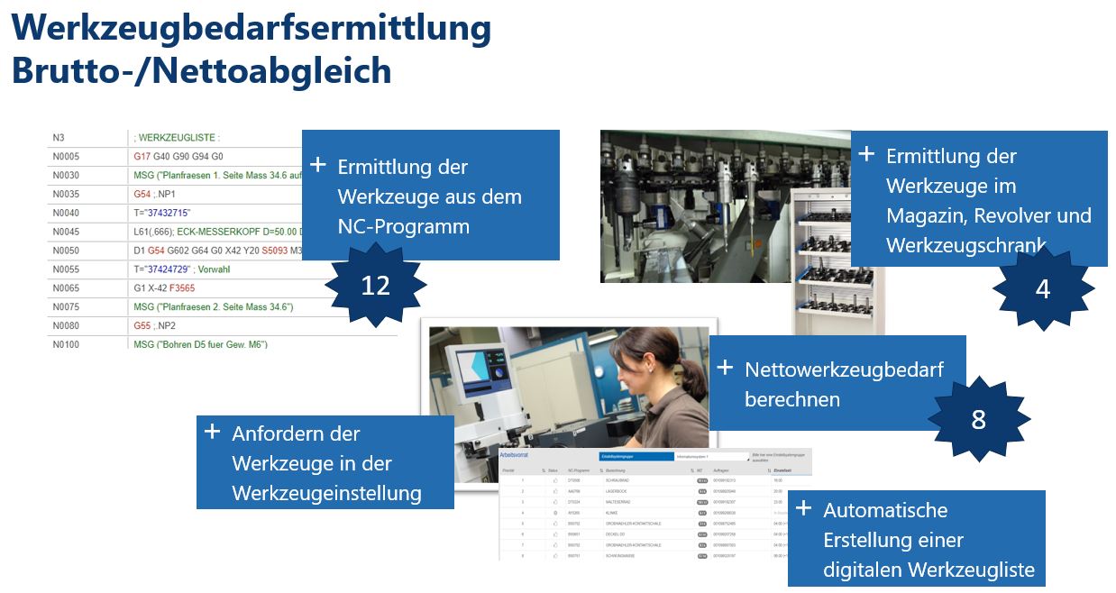 Die für einen Arbeitsgang fehlenden Werkzeuge mussten bisher von Ihren Maschinenbedienern im Kopf oder mit Stift und Papier ermittelt werden. Dies übernimmt jetzt unsere intelligente Werkzeugmengenbedarfsrechnung und Ihr Mitarbeiter kann sich voll auf die Fertigung konzentrieren.