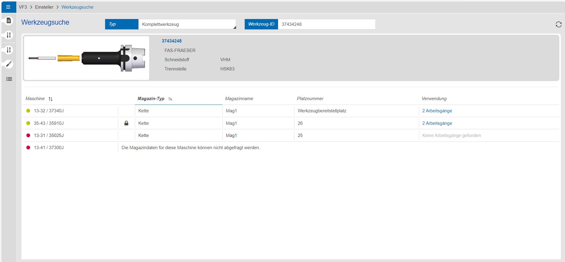 Mit unserer maschinenübergreifenden Werkzeugsuche wird Ihr gesamter Maschinenpark online nach Komplett- und Elementwerkzeugen durchsucht. In kurzer Zeit ermittelt ValueFacturing® die Magazin- bzw. Revolverplätze der Maschinen, in denen sich das gesuchte Werkzeug befindet. Dabei werden auch Werkzeuge im so genannten „Virtuellen Werkzeugmagazin“ gefunden, also Werkzeuge, die sich nicht in der Maschine sondern in einem von ValueFacturing® verwalteten Schrank an der Maschine befinden. Zusätzlich werden die Arbeitsgänge im Auftragshorizont auf den Maschinen angezeigt, für die das gesuchte Werkzeug eingeplant ist.