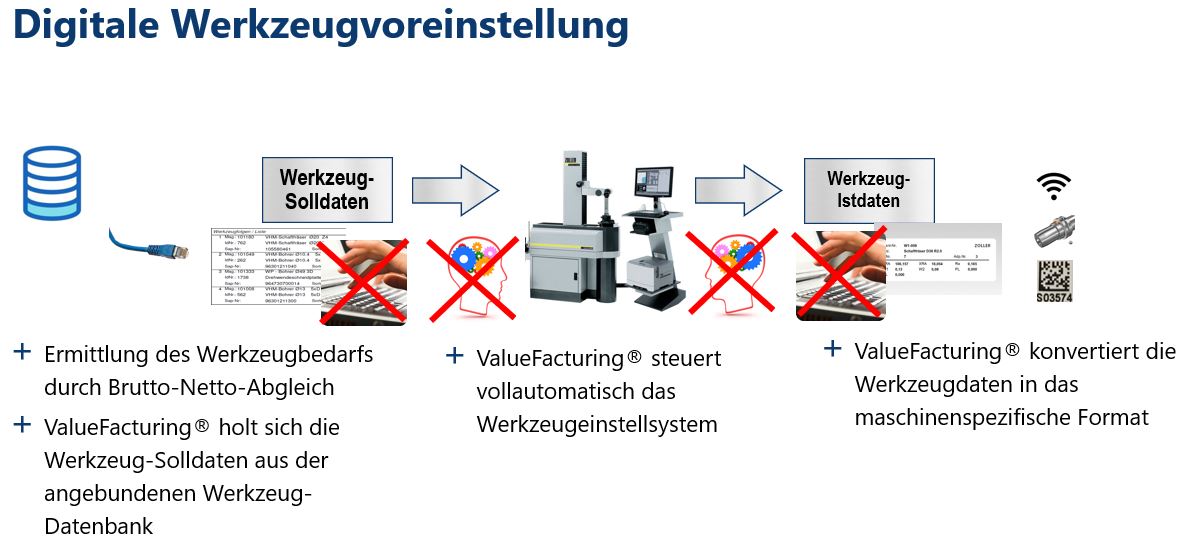 ValueFacturing® speichert die Werkzeugdaten nach der Vermessung zunächst in einem internen, maschinenneutralen Format. Beim Rüsten der Werkzeuge in die Magazine und Revolver der Maschinen werden die Werkzeug-Istdaten durch den integrierten Postprozessor in das maschinenspezifische Datenformat umgewandelt und via LAN, WLAN oder Chip an die Maschinensteuerung übertragen.
