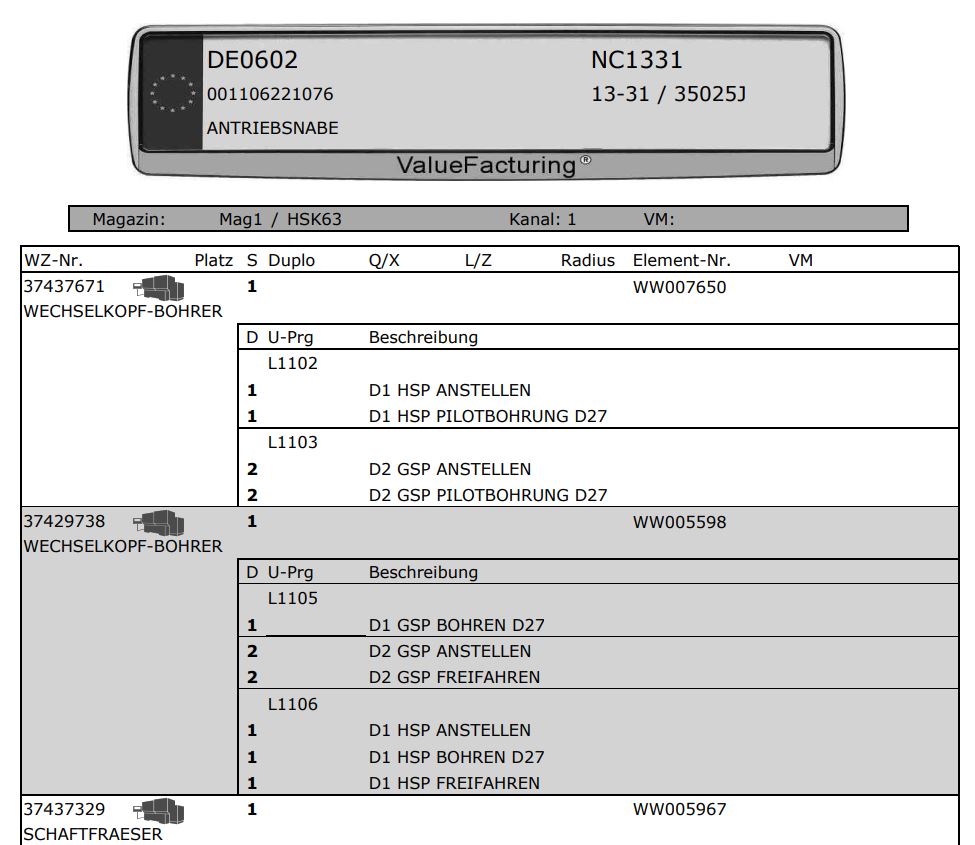 Unser Modul Werkzeug-Management unterstützt Sie bei der Entnahme von Werkzeugelementen, deren Montage und der Werkzeugvoreinstellung. Informieren Sie sich im Folgenden auch über unsere rückfragefreie Werkzeugmontagegrafik und die Möglichkeiten, Werkzeuge am Einstellgerät automatisch und ohne manuelle Eingaben zu vermessen. Die händische Eingabe von Werkzeugdaten an der Maschine gehört mit ValueFacturing® endgültig der Vergangenheit an. ValueFacturing® überträgt Werkzeugdaten per LAN, WLAN oder Chip auf Ihre Maschinen und wandelt sie dem integrierten Postprozessor in das benötigte maschinenspezifische Werkzeugdatenformat um. Unabhängig von Maschinenhersteller und Steuerungstyp.